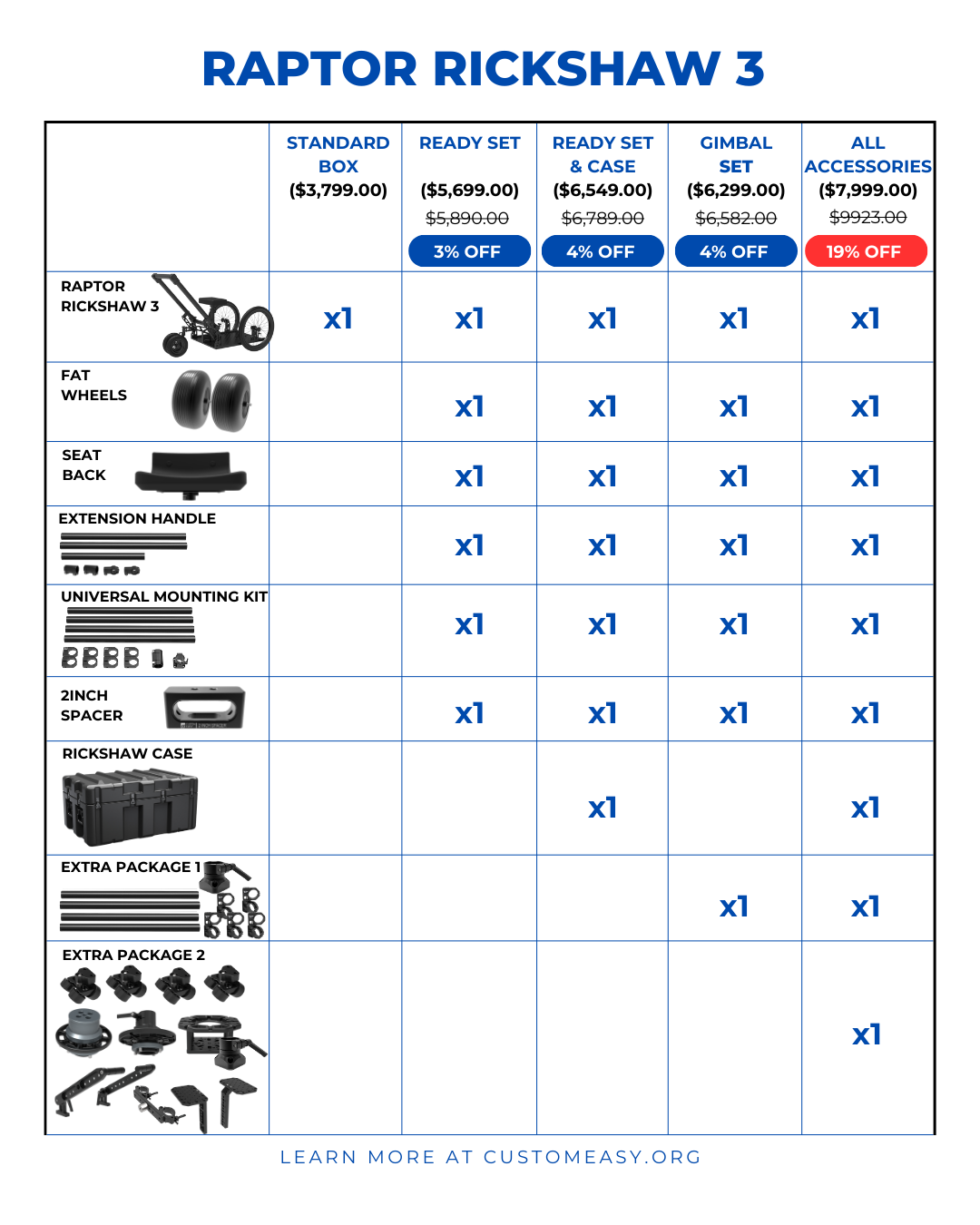 The Raptor Rickshaw 3 supports more than 20 optional accessories. To simplify choices, we’ve created the Ready Set Package, featuring the 5 most popular add-ons: