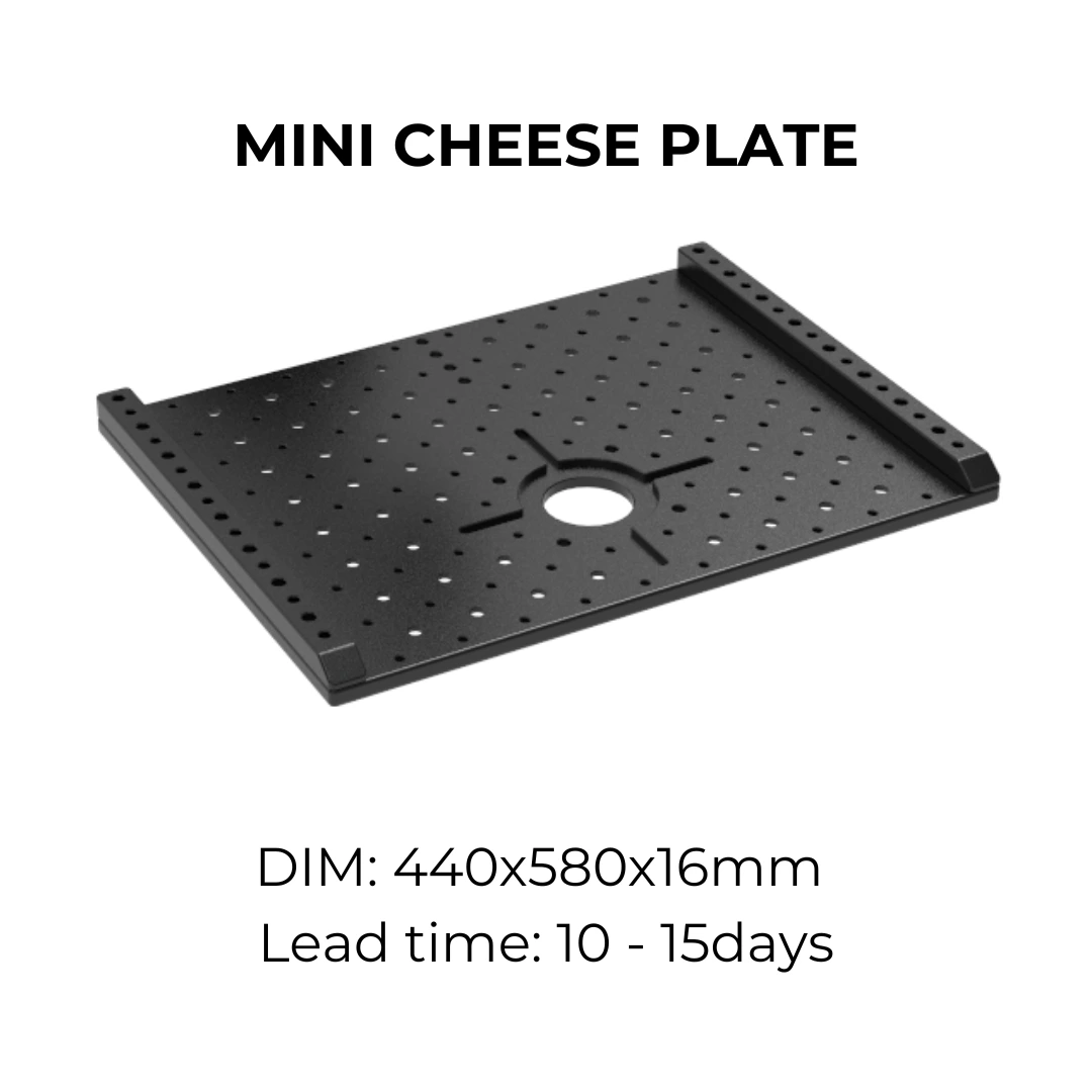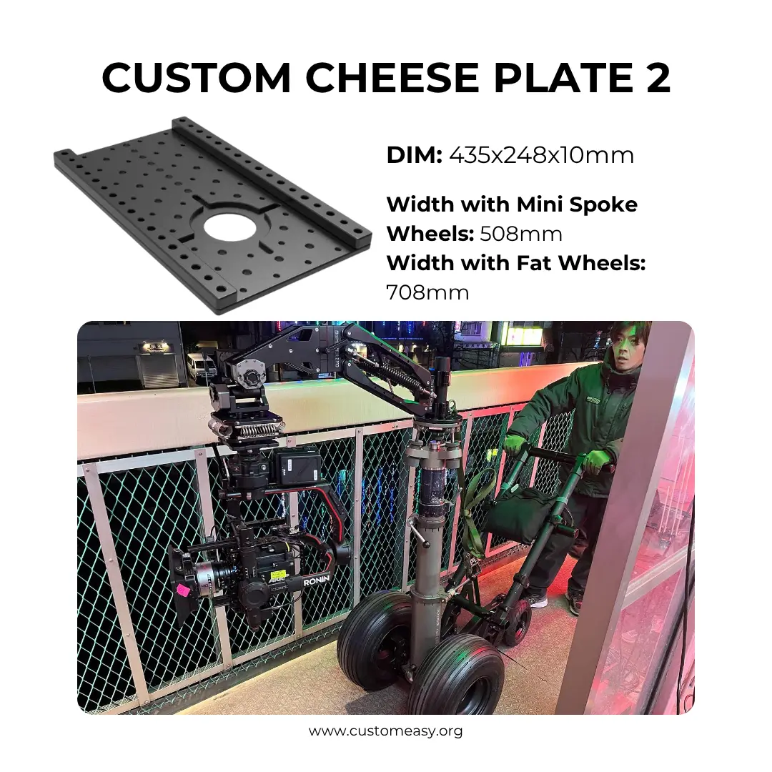 This cheese plate is used on Raptor Rickshaw 3, Raptor Trike, Steadicam Cart and Raptor Rickshaw Lite